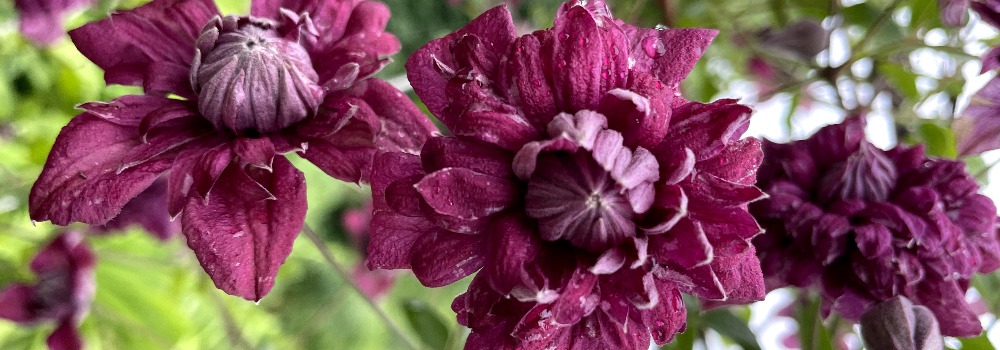 Клематис Пурпуреа Плена Элеганс (Purpurea Plena Elegans) — лиана высотой около трех метров. Вырастает мощным растением и в ширину, имеет много побегов
